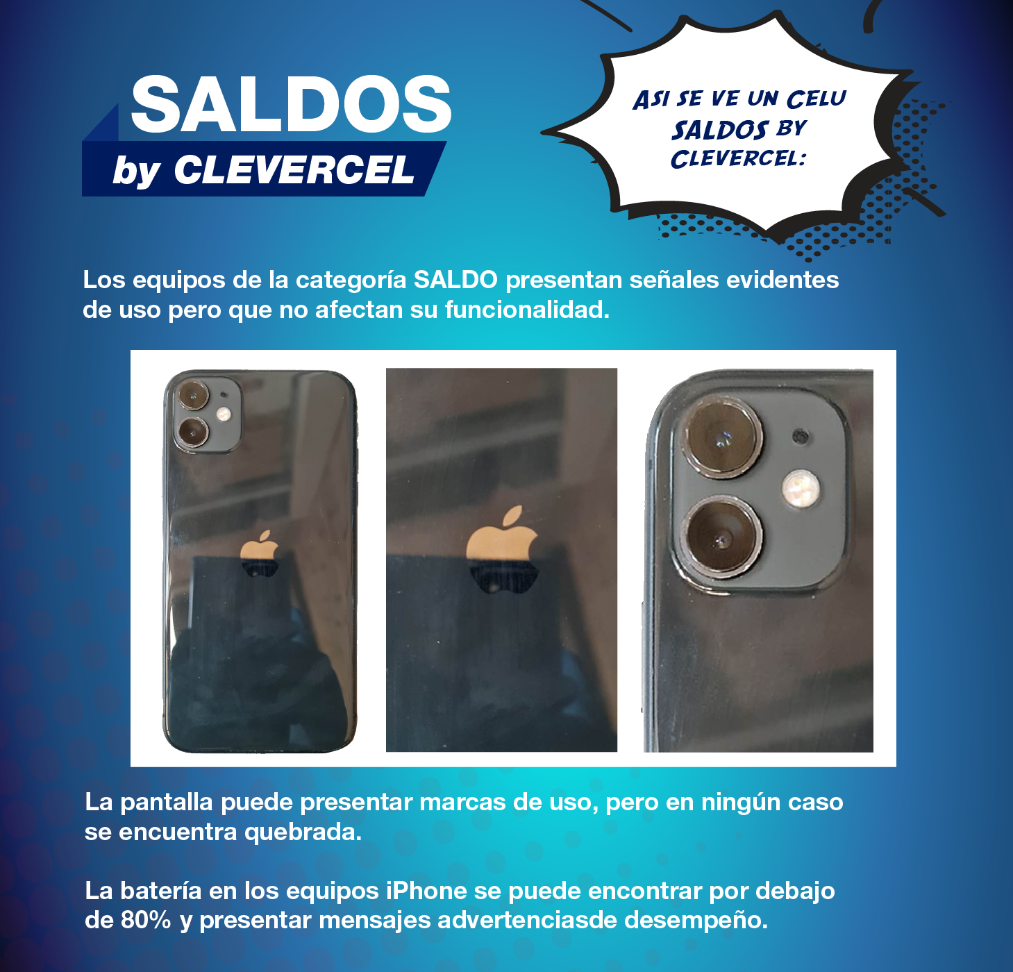 NOTA: Todos los precios publicados correspondientes al precio total (nuevo) del equipo han sido tomados de tiendas en línea de comercios colombianos, con la única intención de mostrar la diferencia entre el precio de un equipo nuevo y los equipos usados de CLEVERCEL.